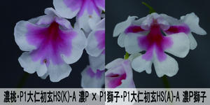 両親共に濃色ピンク系なので濃色ピンク獅子は出るのは確実。あとは花形や斑紋形状となります。「花粉親のピンク獅子の花形や斑紋形状がね…」とお思いかもしれませんが、この花の親になってる獅子ピンクの花形が悪いのであって、その影響がもろ出てます。(花粉親の獅子ピンクでも花形はずいぶん改良してるのです) 紅斑紋の元になる「P1大仁初玄HS(A)」(この両親に入ってる紅斑紋【曾祖父さん】)ってのが当時でもかなりレベルの高い紅斑紋でした。