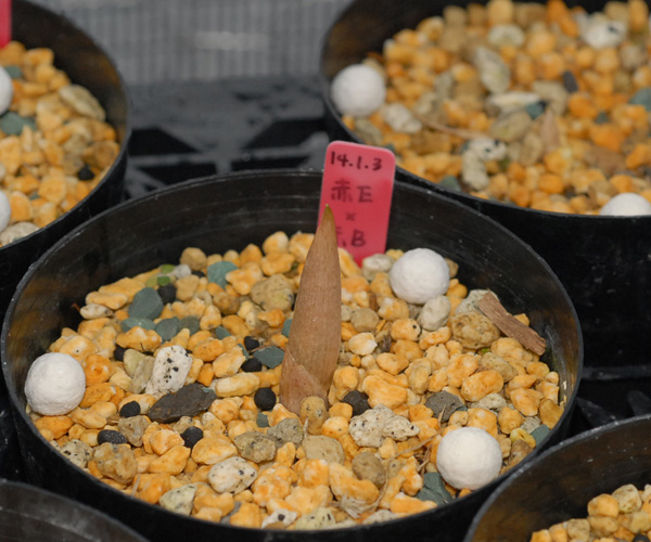 特に育ちのいいものは1球植えにしてますが、袴の色から見て赤花確定っぽいです。あと1作すれば開花球になりそうです。