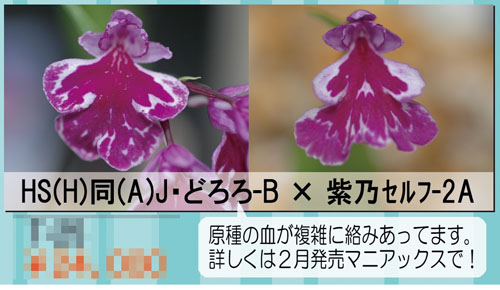 HS(飛天新世紀系) どろろ(毘沙門DH系) 紫乃(まほろぼ寿光女峰系)と分解すれば複雑加減がよくわかります。ポイントは今までの交配にほとんど入っていなかった「女峰」が紫乃SFに入っていることでしょうか。詳しくは2月売りのマニアックスに書いています。簡単に言ってしまうと交配深度と原種の血の数で芸は複雑になるようなので、この交配には期待大です。
