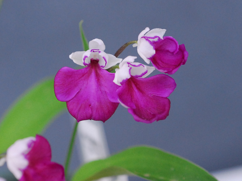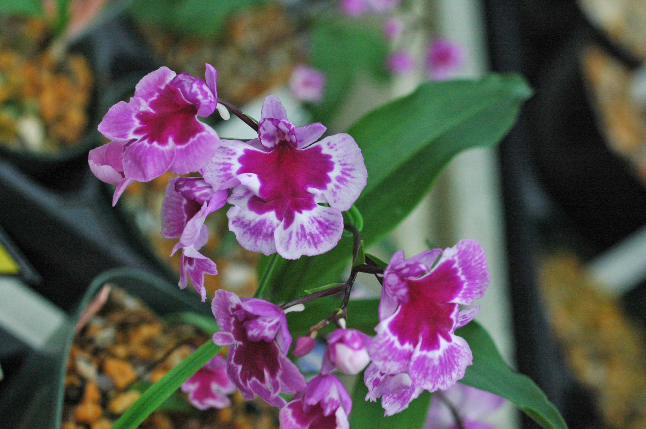 一見両方とも白韋駄天獅子ですが、上は学宝交配からの完全純白系の白韋駄天獅子、下はピンク韋駄天獅子を作出しするための副産物で出てきた見た目が白韋駄天獅子。要するにピンク無点韋駄天獅子となります。ピンクは基本的に地色が白く、花粉塊も黄色、子房と軸に色味がないので、ピンク無点になると見た目は白に見えます。白韋駄天獅子とピンク系白韋駄天獅子を並べても人間の目には見分けがつきません。花形はピンク系韋駄天獅子のほうがいいですけどね。